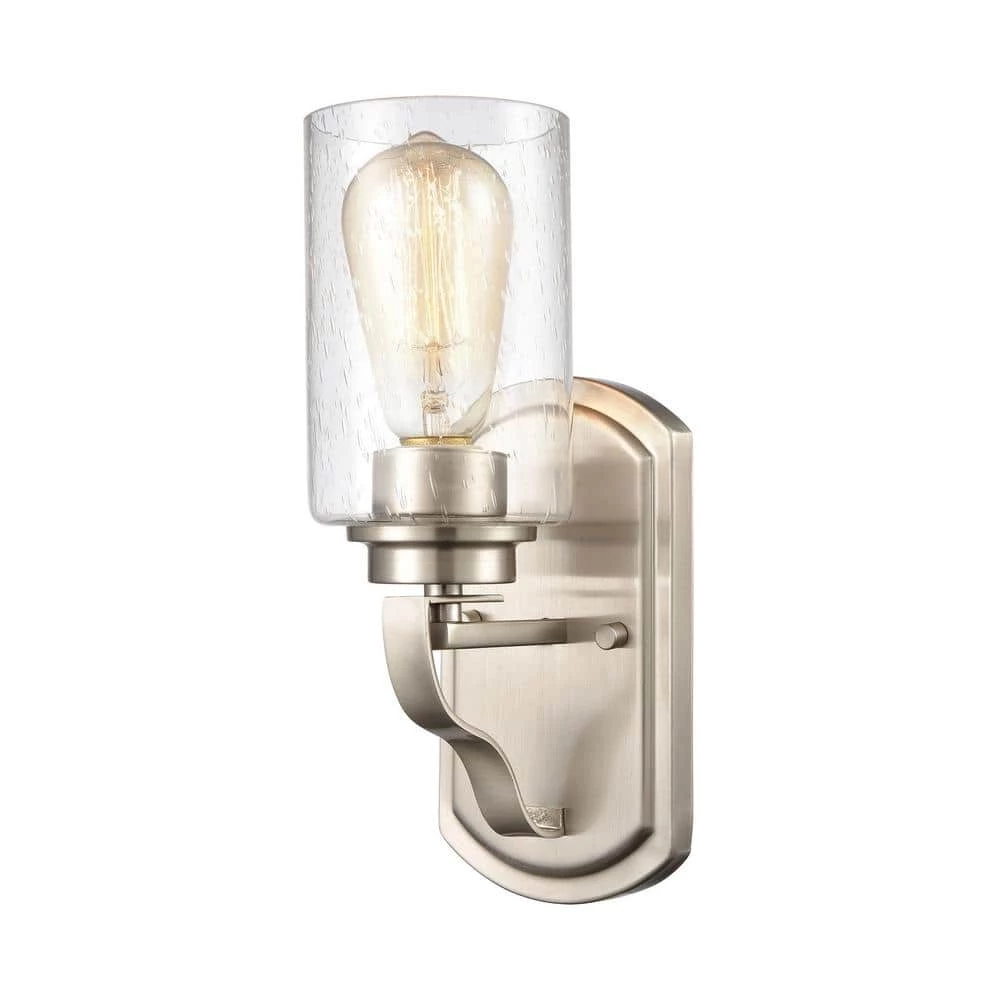 The Market Square 1 Light Sconce combines the simple elegance of traditional design with modern aesthetics. Perfect for adding ambient lighting to a transitional bedroom, living room, hallway or dining room, this piece is crafted from metal and comes in a brushed nickel finish. Its single bulb is held upright and covered by a cylindrical shade in clear glass. This light is a great addition to any room. Adds a touch of style.
