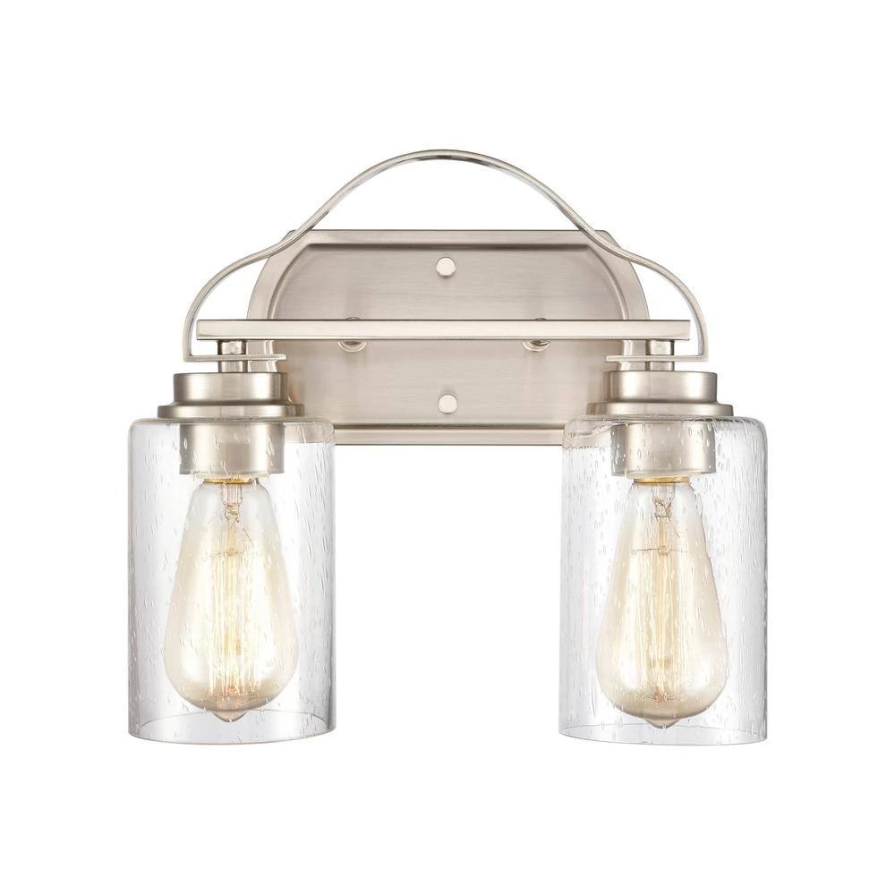 The Market Square 2 Light Vanity combines the simple elegance of traditional design with modern aesthetics. Designed for bathrooms, this-piece is ideal for illuminating a mirror or providing ambient light. The Market Square light is crafted from metal and comes in a sleek, brushed nickel finish. Its 2 bulbs are held upright and covered by individual, cylindrical shades in clear glass.