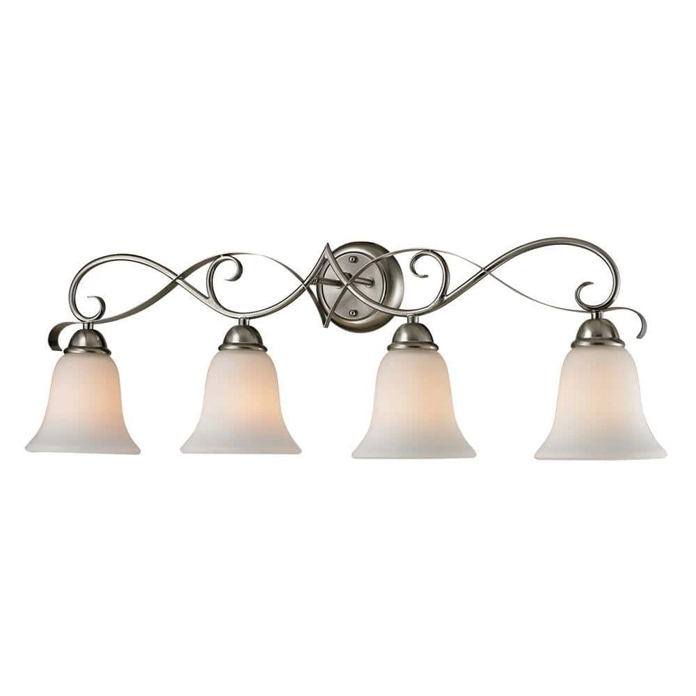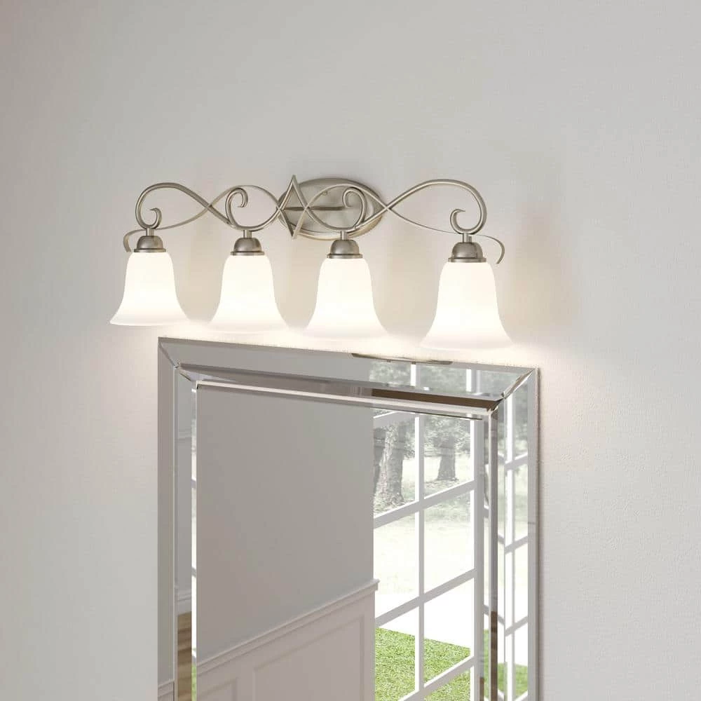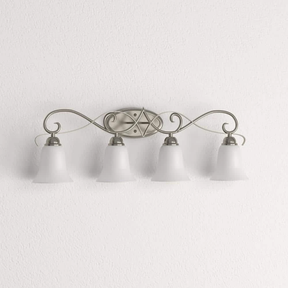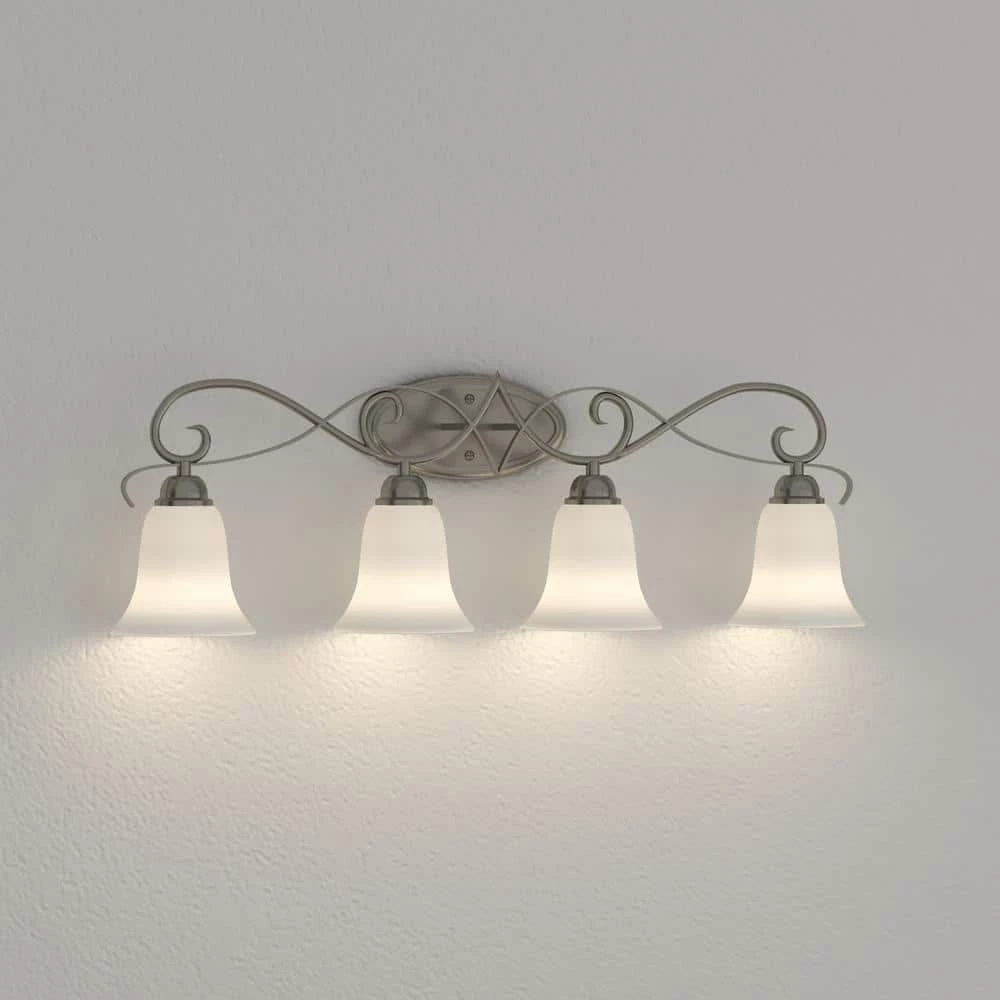 The Brighton 4-Light Brushed Nickel Wall Mount Bath Bar Light has a white color, adding elegance and style to any decor. Finished in brushed nickel for a contemporary flair, it’s pre-wired for simple installation. UL listed for safety. Hardware included.