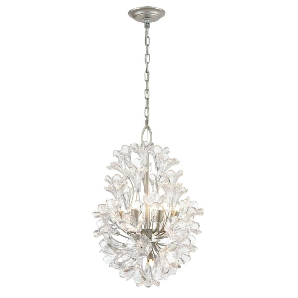 The Celene 9-light chandelier showcases oversized clear glass flowers which capture the light to create a radiant sprouting bouquet. The Aged Silver finish compliments the glass. A great addition to any room.