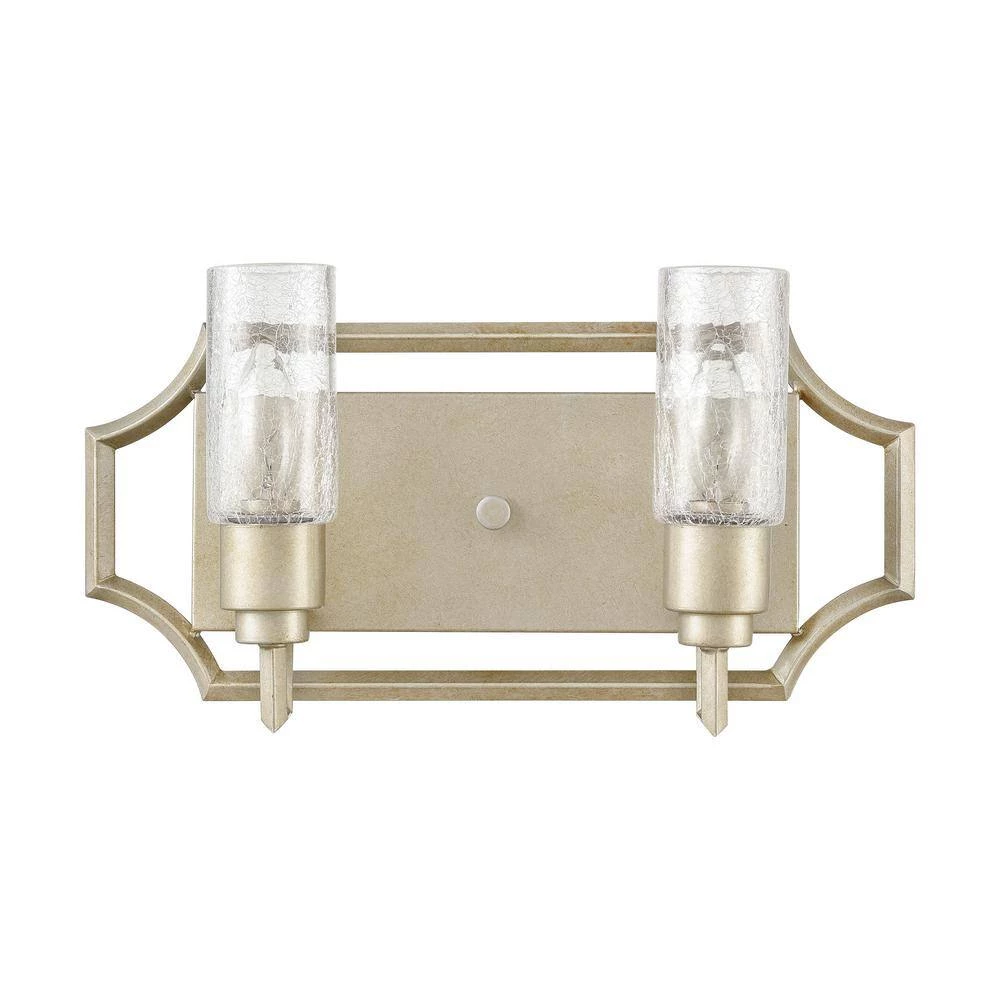 The Cheswick 2-light vanity showcases crackled glass cylinders arranged within a geometric framework. The crackled glass diffuses the light which is softened further by the Aged Silver finish. A great addition to any room. Can be used with LED bulbs.