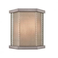 The Crestler sconce showcases a bold hexagonal shape with angular outer metalwork and a hexagon-patterned perforated screen. The inner shade has a soft beige fabric shade with a frosted hexagon glass diffuser. A weathered zinc finish is complemented with polished nickel.