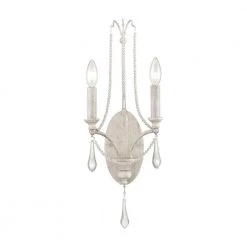 The French Parlor 2-light sconce exemplifies a timeless elegance with classic draped crystal beads and large glass drops. The Vintage White finish adds an antique chic appeal. This light is a great addition to any room. Adds a touch of style.