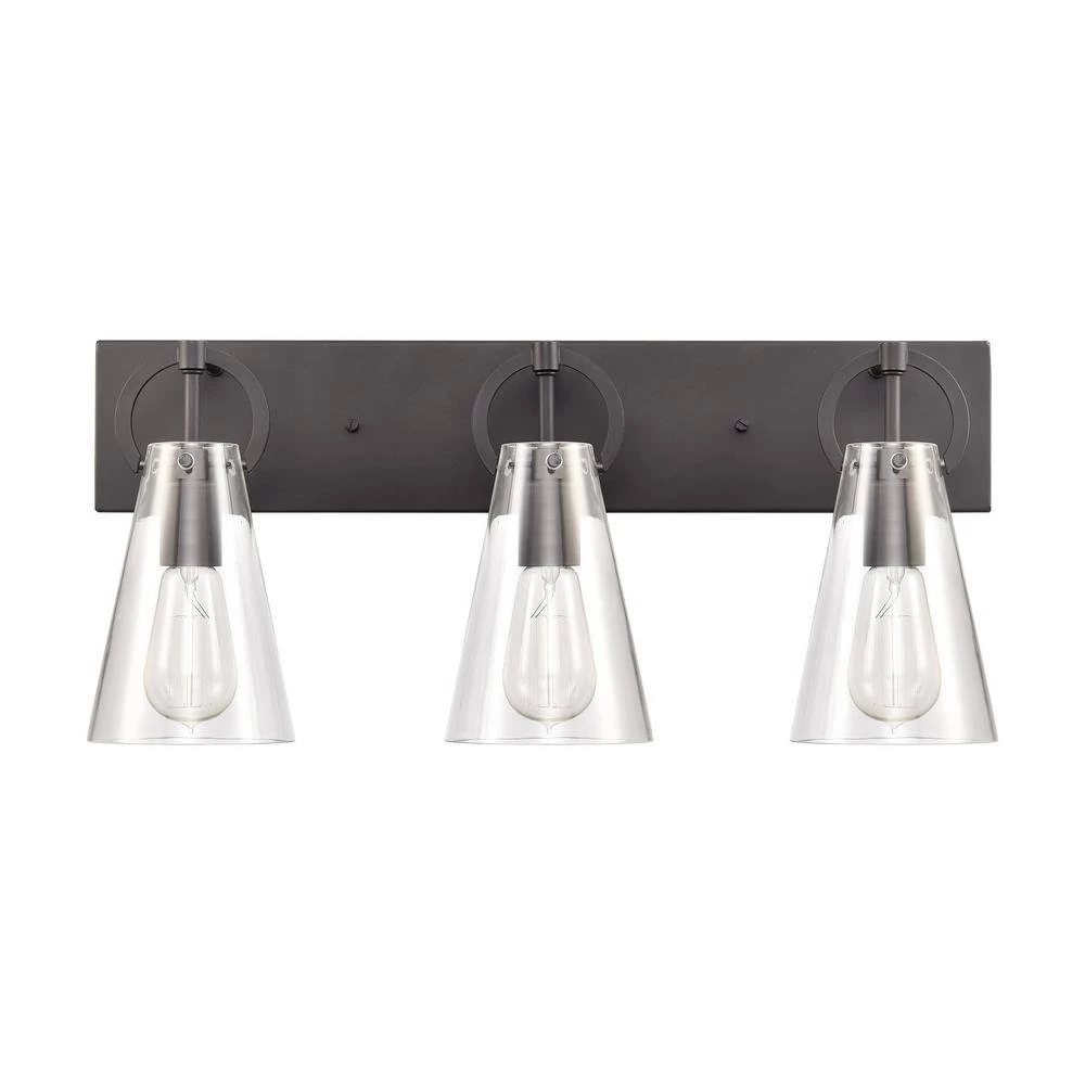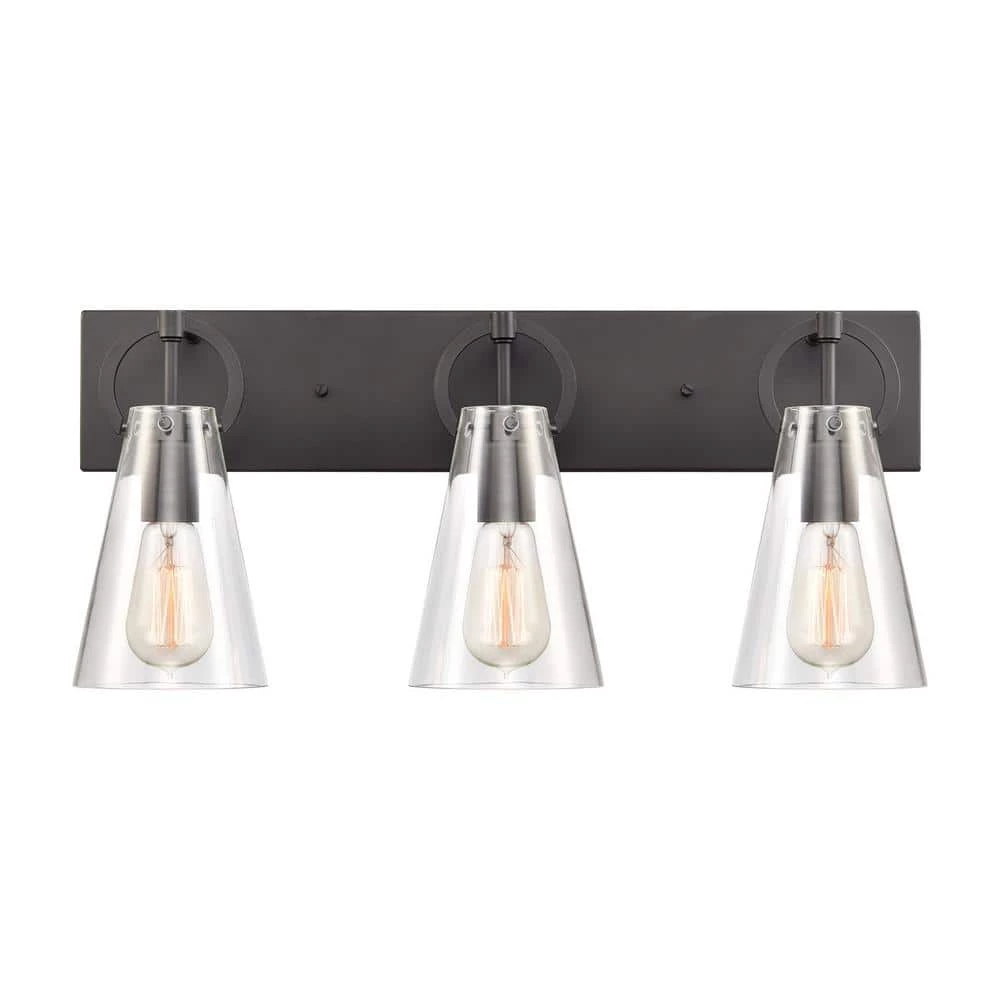 The Gabby 3-light vanity has a trend-forward die cast ring that “clasps” a conical shaped glass. Finished in Matte Black with clear glass. A great addition to any room. Can be used with LED bulbs.
