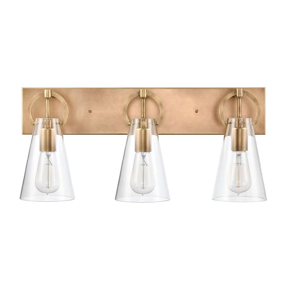 The Gabby 3-light vanity has a trend-forward die cast ring that “clasps” a conical shaped glass. Finished in Natural Brass with clear glass. A great addition to any room. Can be used with LED bulbs.