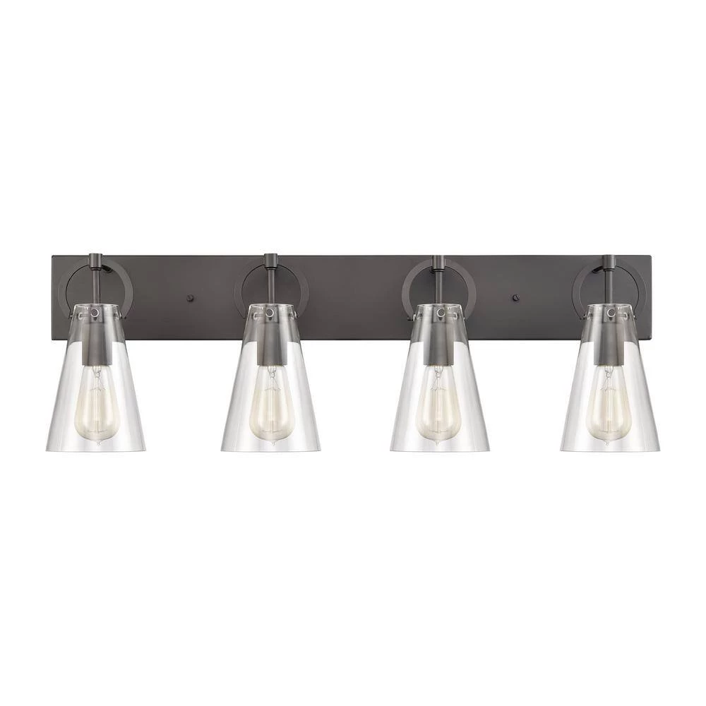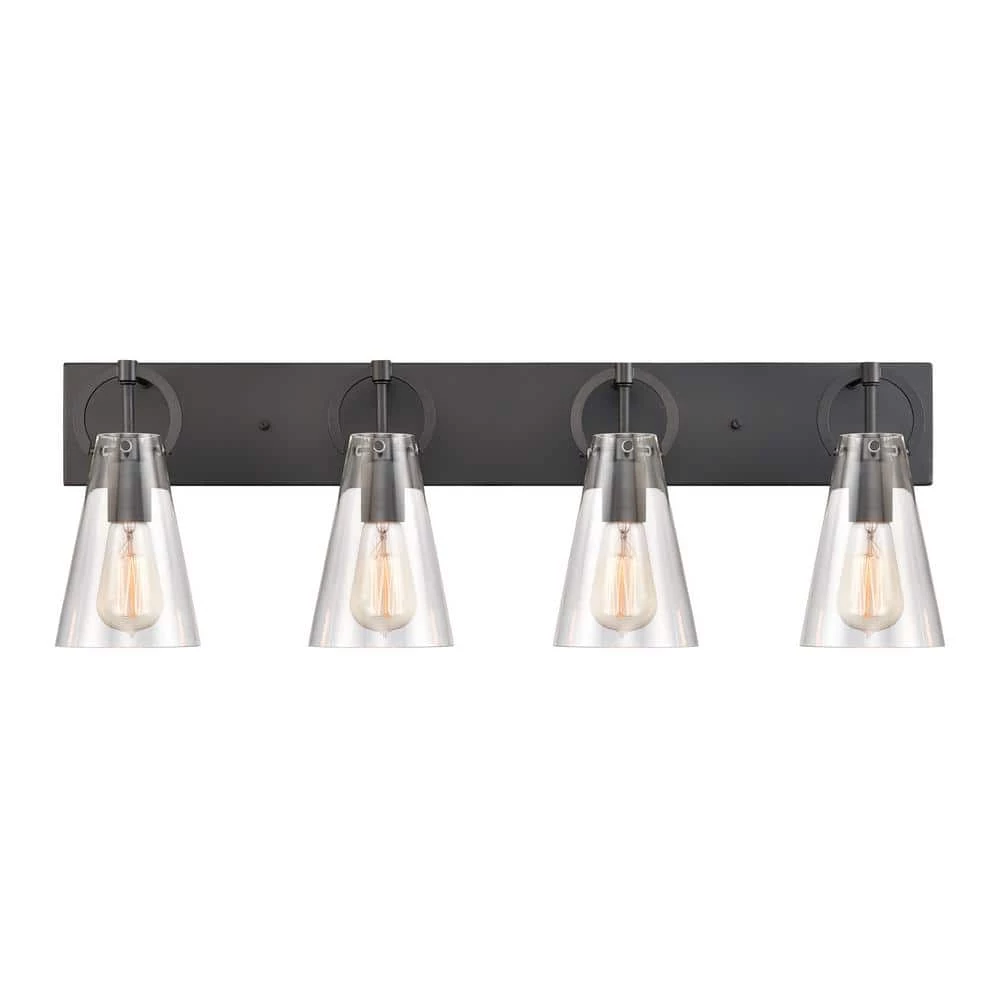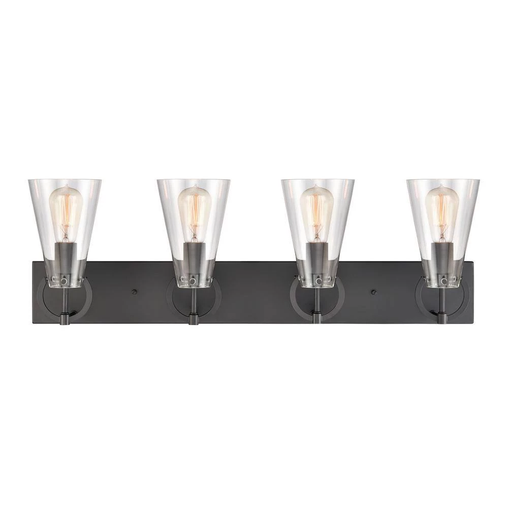 The Gabby 4-light vanity has a trend-forward die cast ring that “clasps” a conical shaped glass. Finished in Matte Black with clear glass. A great addition to any room. Can be used with LED bulbs.