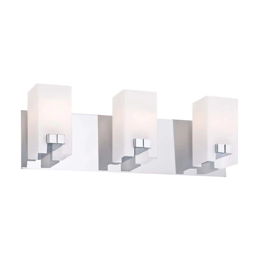 Gemelo vanities are like a crisp white shirt with shiny cufflinks. Opal white glass and polished chrome hardware and details make for a handsome vanity light in contemporary bathrooms. Indoor use only.
