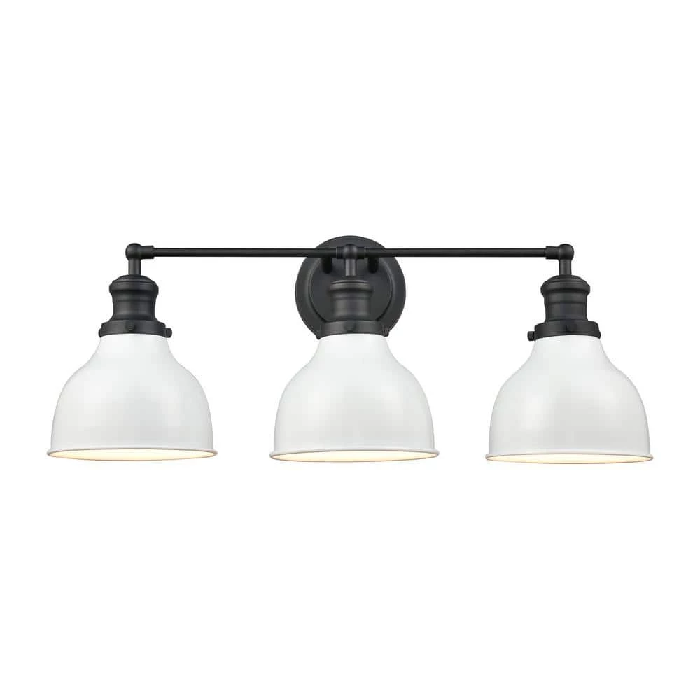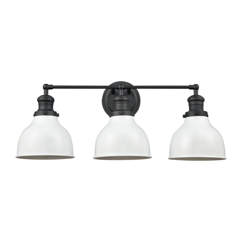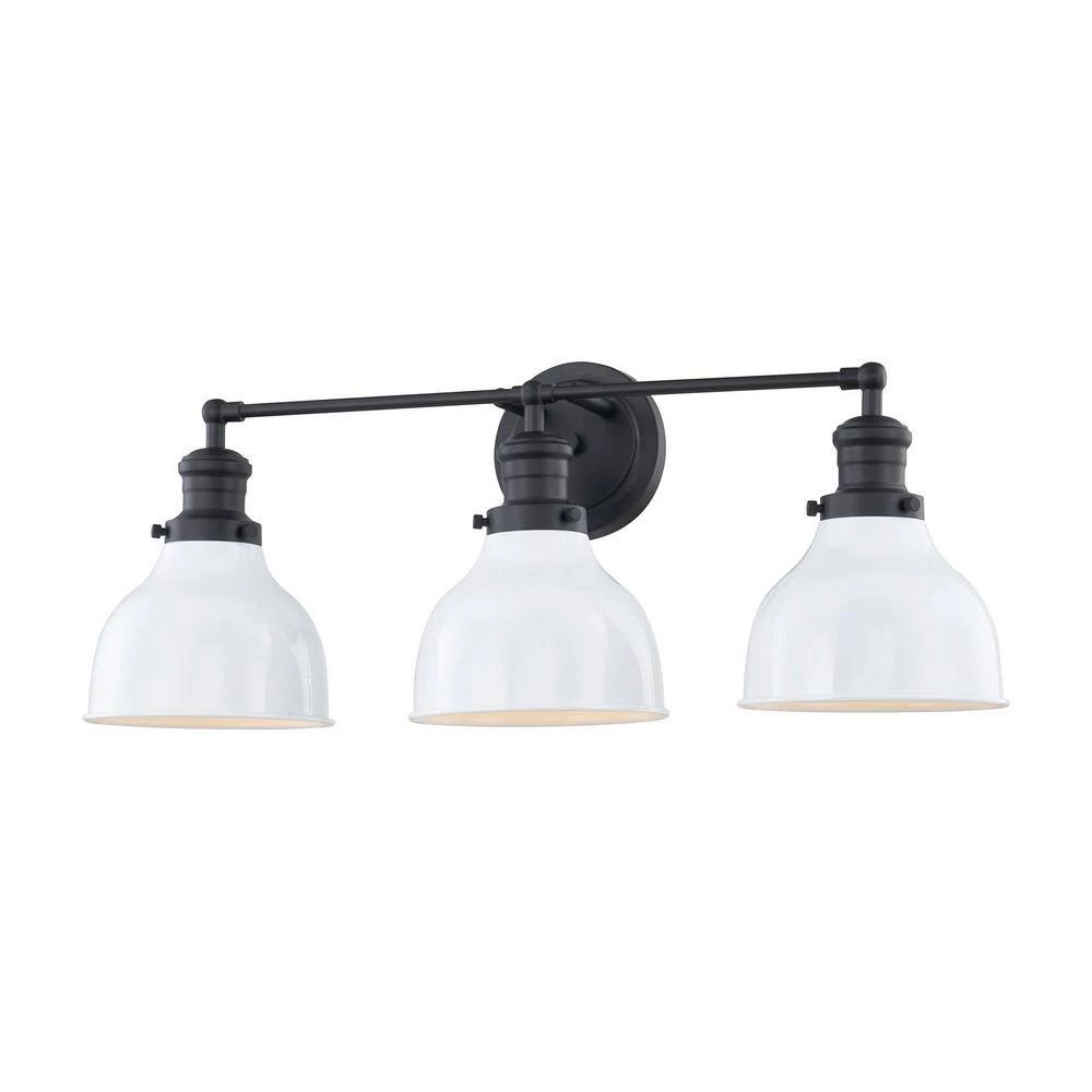 The Holgate 3-light vanity brings a clean, fresh look to modern farmhouse styling. The metal shades have a smoothly curved shape clasped held by crisp spun hardware. Finished in Charcoal with Enamel White metal shades.