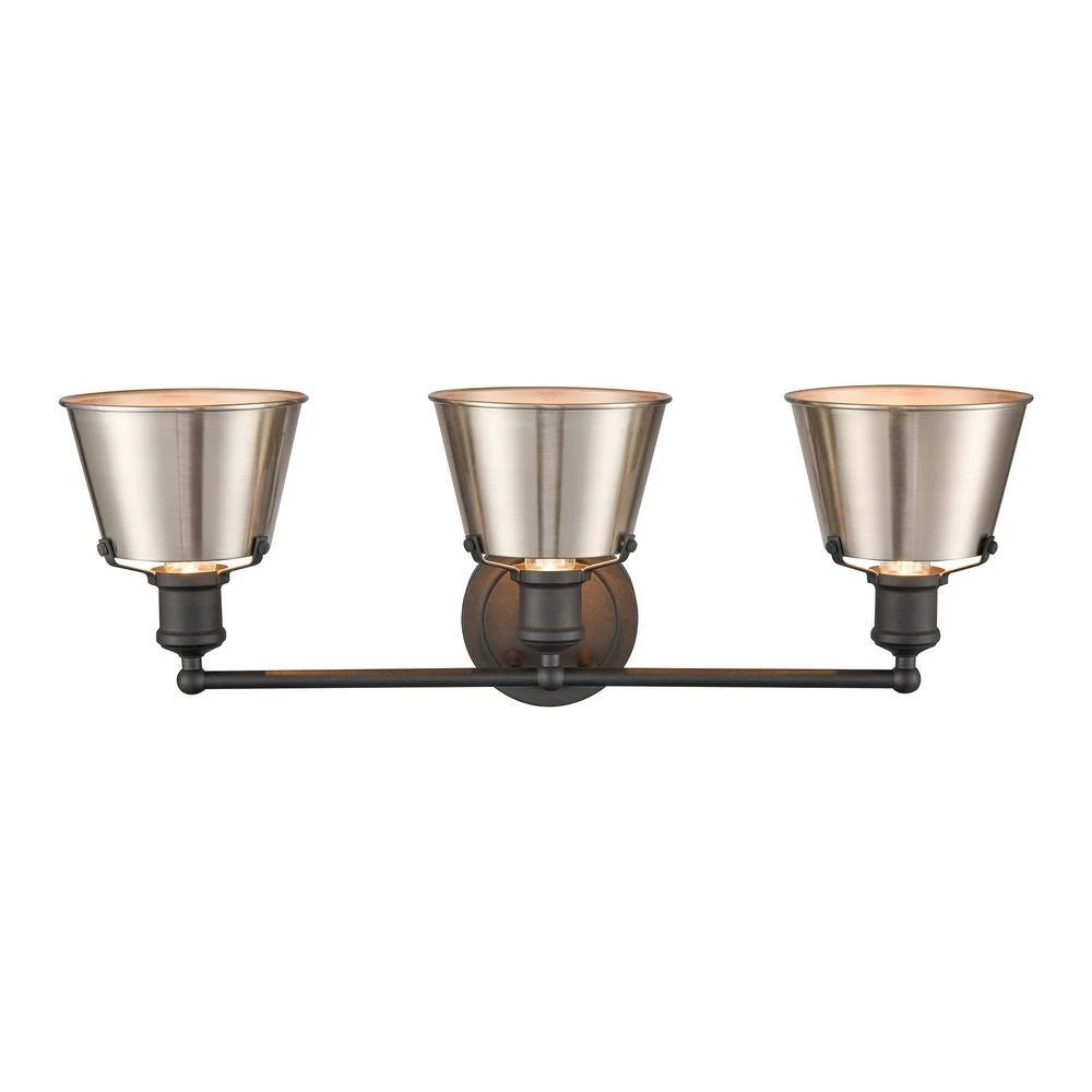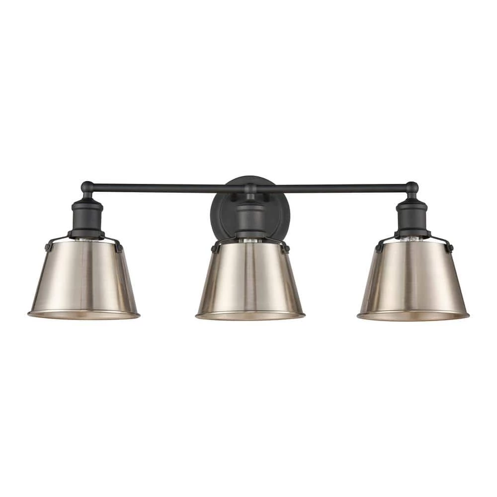 The Holgate 3-light vanity brings a clean, fresh look to modern farmhouse styling. The metal shades have a simple, tapered shape clasped by unique metal hardware. Finished in Charcoal with Satin Nickel metal shades.