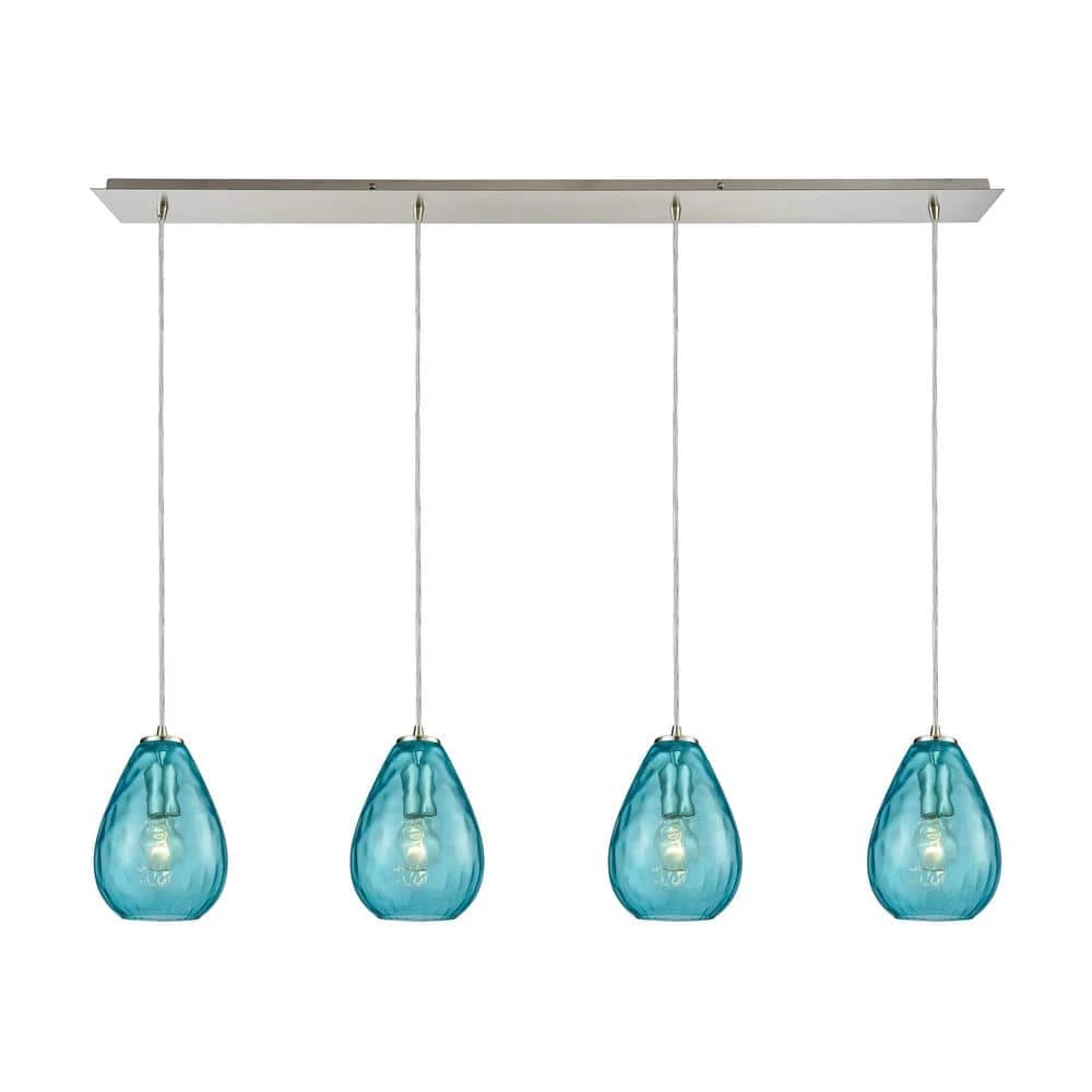 Lagoon 4-Light Linear Pan In Satin Nickel With Aqua Water Glass Pendant. A simple solution for any room you wish to add extra light. Titan Lighting’s hanging pendants offer various finish and glass options to mix and match to update your home. All pendant lights are rated for indoor dry locations. Pendants are shipped with installation hardware, wire and canopy.