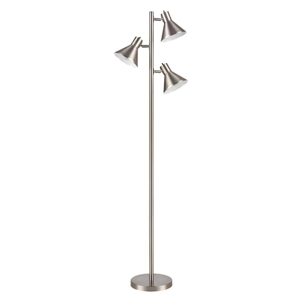 The Loman floor lamp is made from metal in a satin nickel finish. This design features a tree style arrangement of 3 spot lights that can be adjusted in angle, making it ideal for adding to reading corners or as ambient light for seating areas. Featuring metal light shades that add a hint of mid century design, this lamp stands on a round metal base for stability. The Loman is also available in white and black paint finishes.