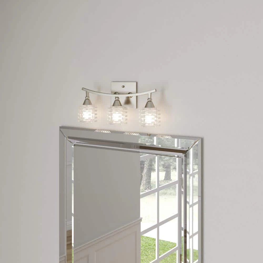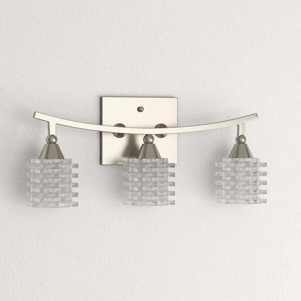 This vanity light features an arched bar which is finished in Brushed Nickel. It also features a unique glass diffuser. A distinctive design for any decor.