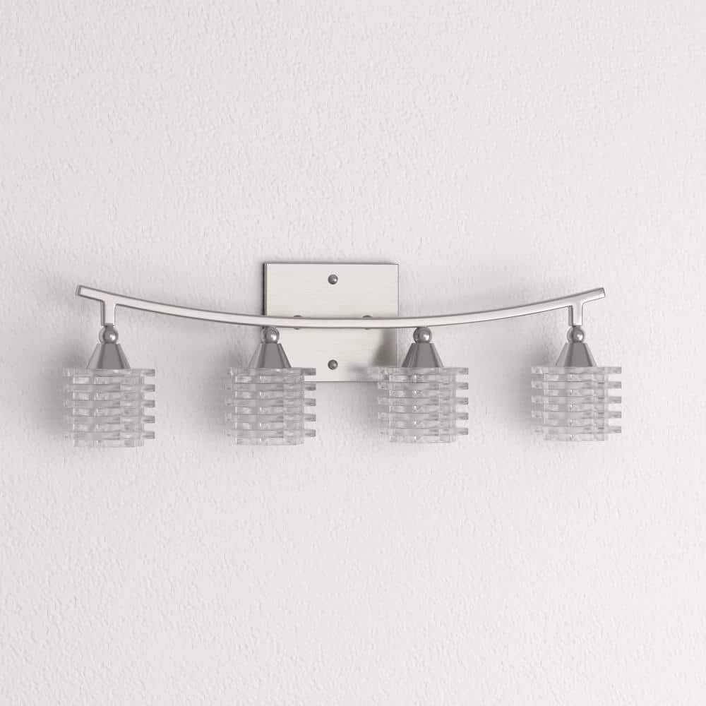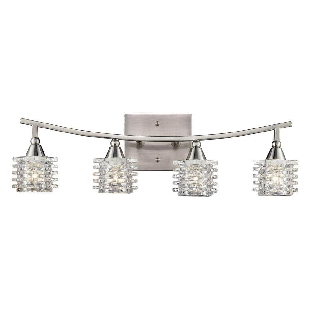 This vanity light features an arched bar which is finished in Brushed Nickel. It also features a unique glass diffuser. A distinctive design for any decor.