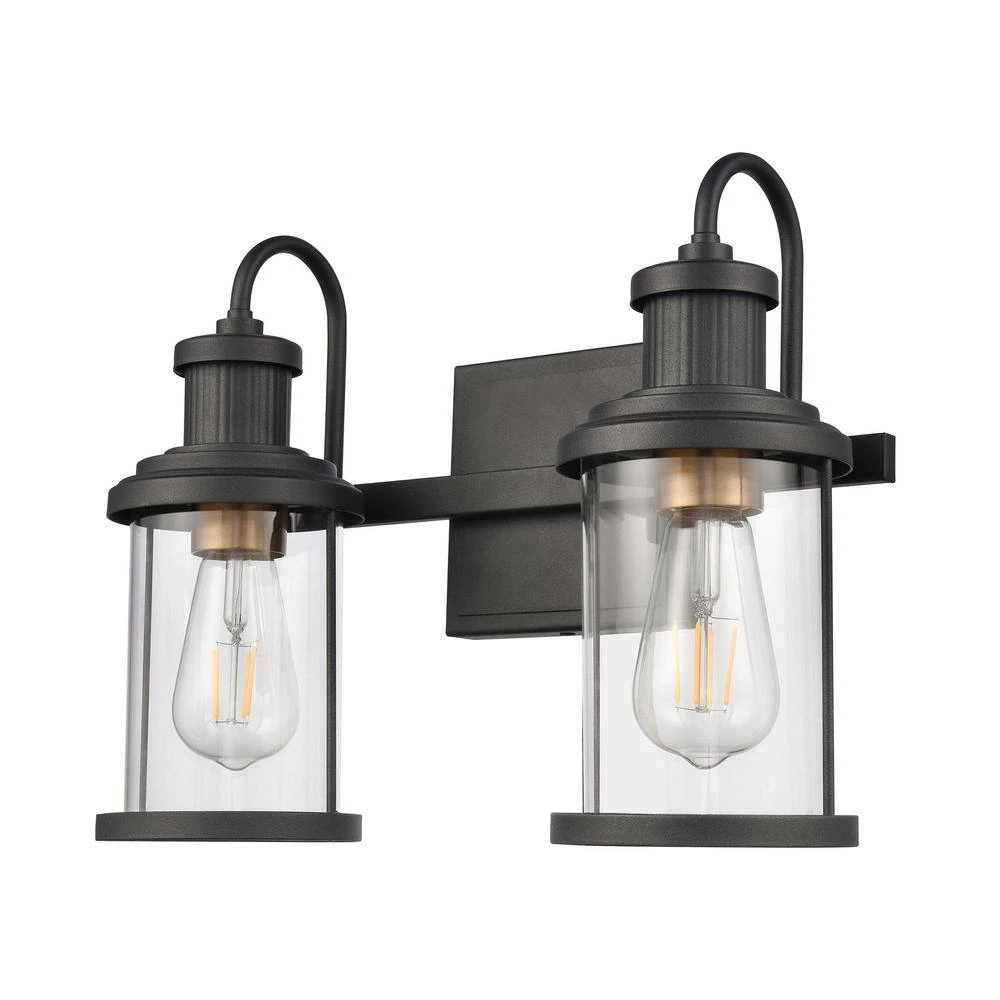 The Millburn 2-light vanity has a classic design with an oversized spun glass holder. Ideal for coastal or modern farmhouse style interiors, its subtle industrial tone adds a bit of timeless charm. Finished in Matte Black with Burnished Brass accents and clear glass.