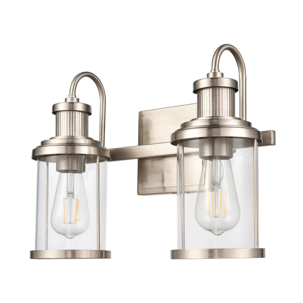 The Millburn 2-light vanity has a classic design with an oversized spun glass holder. Ideal for coastal or modern farmhouse style interiors, its subtle industrial tone adds a bit of timeless charm. Finished in Satin Nickel with clear glass.