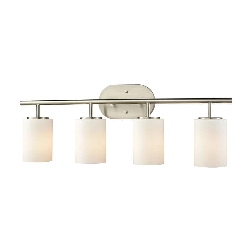Pemlico Satin Nickel Frame with White Glass bath light, 4-light. Titan LightIng’s bath lights offer various fInish and glass options to mix and match to update your home. All bath lights are rated for Indoor locations. bath lights are shipped with Installation hardware.