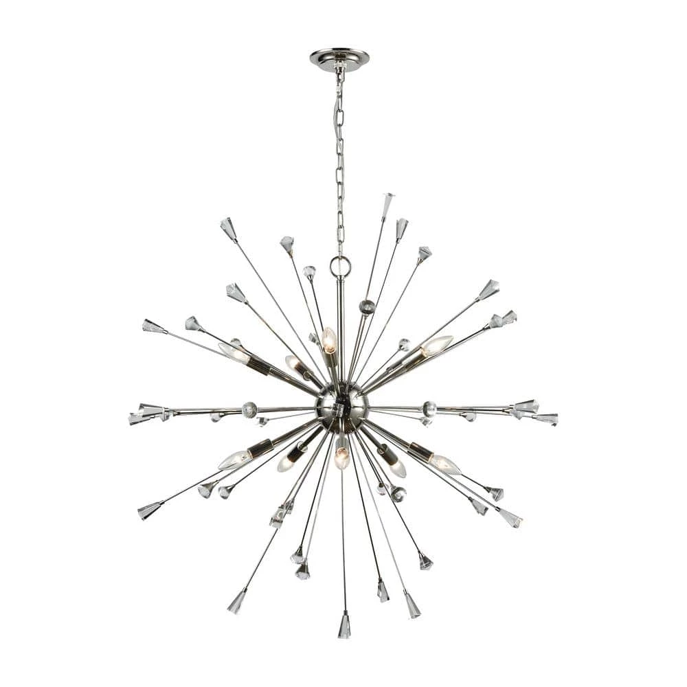 The Sprigny chandelier showcases a starburst design with exuberant crystal-tipped extensions. Finishes include Matte Gold with amber teak crystal or Polished Nickel with clear crystal. Titan Lighting’s chandeliers offer various finish and style options to mix and match to update your home. All chandeliers are rated for indoor dry locations. Chandeliers are shipped with installation hardware.