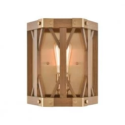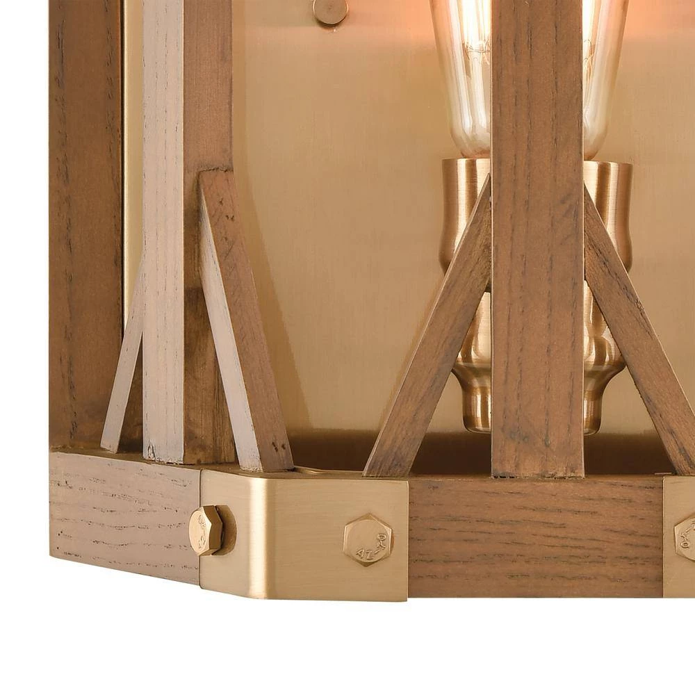The post and beam style, dating back thousands of years, can be found in many barns and homes across America and around the world. The Structure sconce emulates this traditional building technique with a boldly scaled and intricate lighting design. This item has 3 sizes of solid wood pieces that are joined together into a complete fixture with accenting metal hardware fitted with oversized nuts and bolts at each angle. The medium oak finish is complemented with satin brass metal accents.
