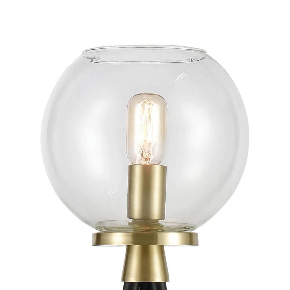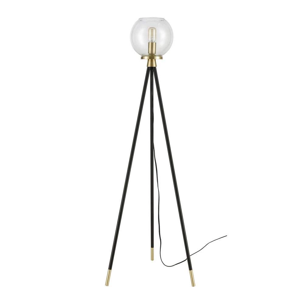 Modern farmhouse style combines with notes of urban industrial appeal to create the Union Floor Lamp. Its tripod metal frame features a black finish with satin brass appointments, while the light is held within a round, clear glass shade. This item has the added convenience of a foot switch.