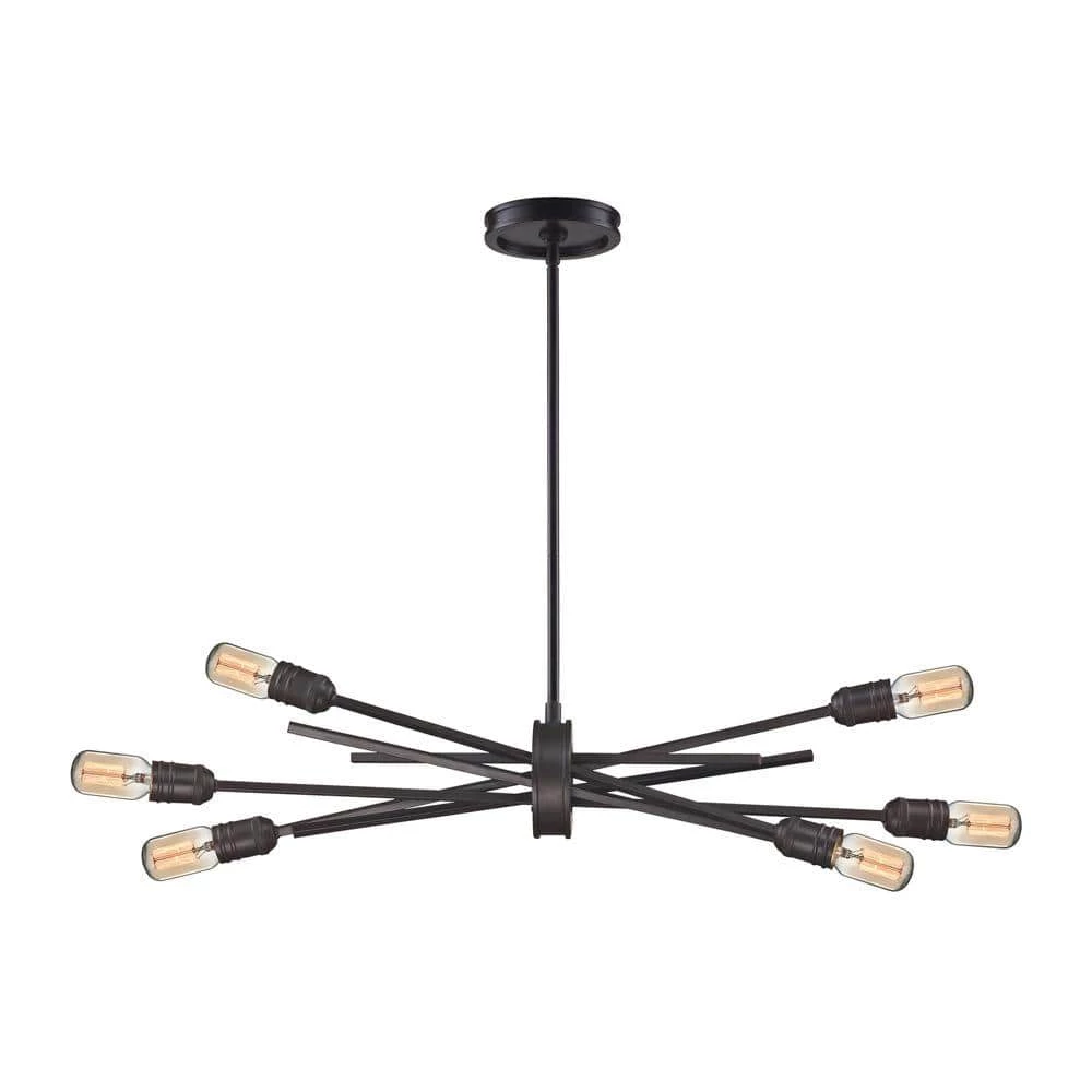 Xenia 6 Light Chandelier In Oil Rubbed Bronze. These fixtures showcase a unique linear design with unequal length arms that pass through the fixture’s central connection. The metal arms can be easily adjusted from a near parallel position to a loosely gathered look. An Oil Rubbed Bronze finish and optional filament bulbs complete this innovative series.